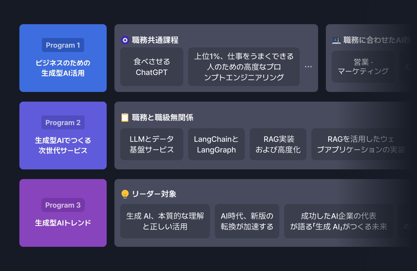 入門から実践応用まで、職務や職階に最適化された3段階の教育プログラムを通じて、AIを業務に迅速に適用し、組織全体のAXを加速させます。
